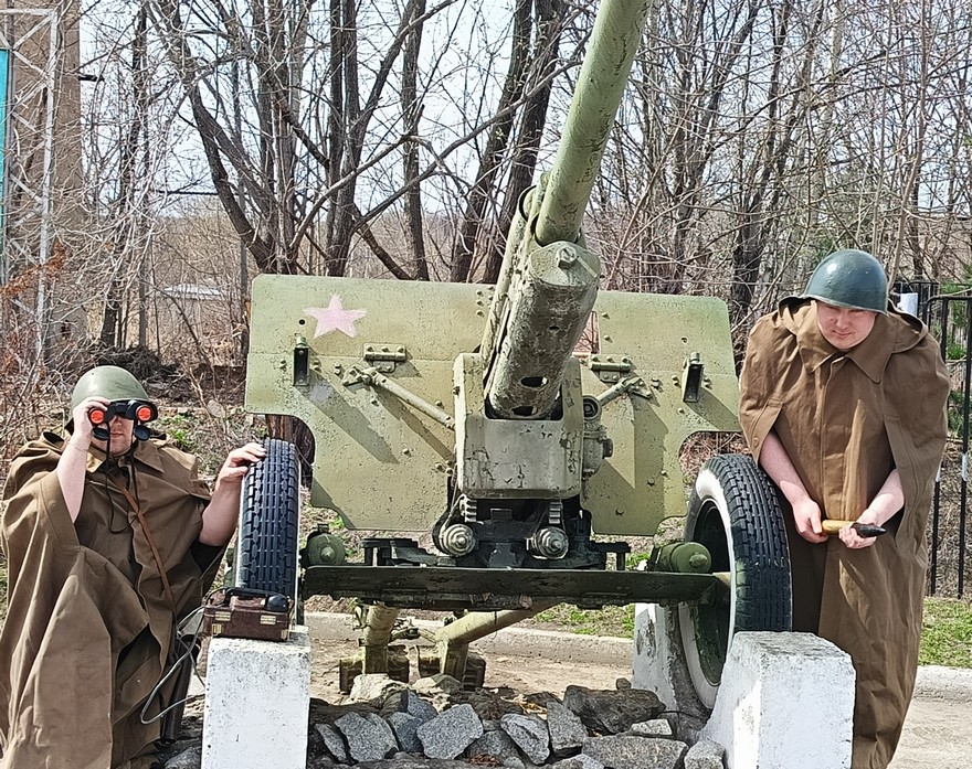 Наведение 76-мм дивизионной пушки при наступлении в боях за Сталинград – наводчик орудия сержант Красной Армии (помощник судьи А.А. Нагорный) и снарядный артиллерийского расчёта рядовой Красной Армии (секретарь судебного заседания Д.А. Аверьянов).
